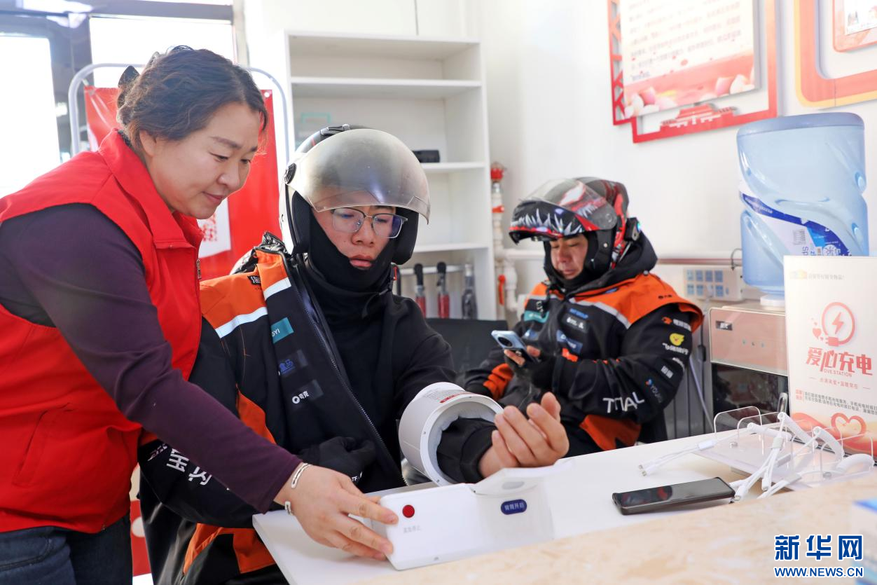 12月2日,在内蒙古自治区扎兰屯市繁荣街道光明社区暖心驿站,志愿者为外卖骑手赠送“能量包”。新华网发(韩颖群 摄)