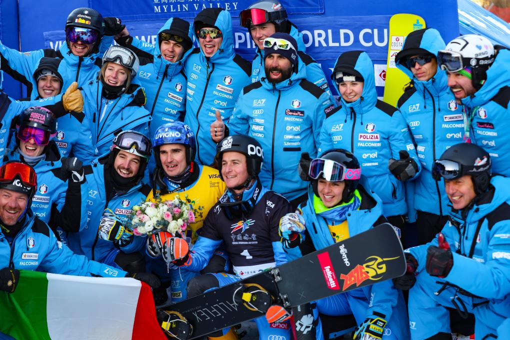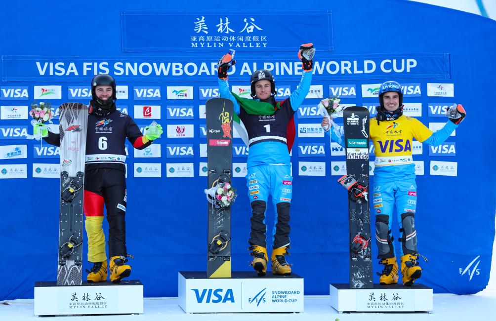 12月6日,男子组冠军意大利选手米尔科·费利切蒂(中)、亚军德国选手斯特凡·鲍迈斯特(左)、季军意大利选手毛里齐奥·博尔莫利尼在颁奖仪式上庆祝。 当日,国际雪联单板滑雪平行项目世界杯美林站平行大回转比赛在内蒙古赤峰市喀喇沁旗顺利收官。意大利选手米尔科·费利切蒂获得男子组冠军,日本选手三木椿获得女子组冠军;德国选手斯特凡·鲍迈斯特获得男子组亚军,意大利选手毛里齐奥·博尔莫利尼获得男子组季军;瑞士选手朱莉·佐格获得女子组亚军,奥地利选手萨比娜·派尔获得女子组季军。
