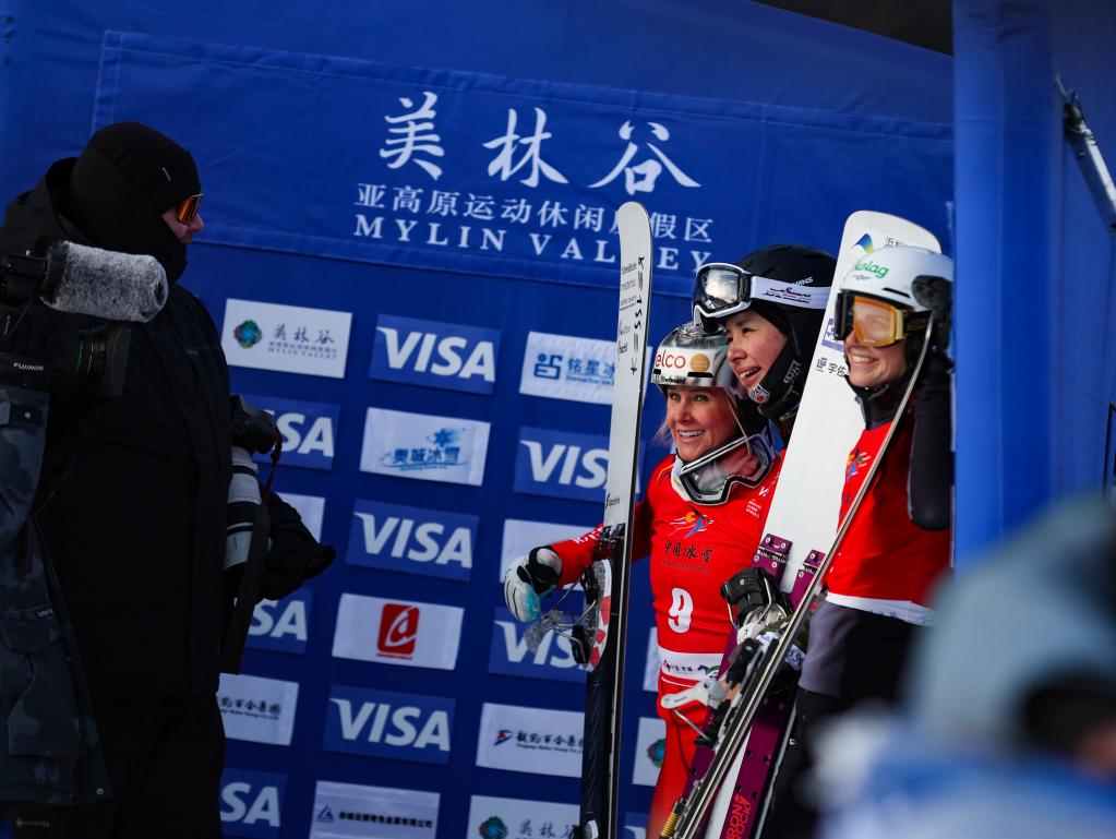 12月7日,女子组冠军日本选手三木椿(前中)、亚军瑞士选手朱莉·佐格(前左)、季军奥地利选手萨比娜·派尔(前右)在颁奖仪式现场进行交流。