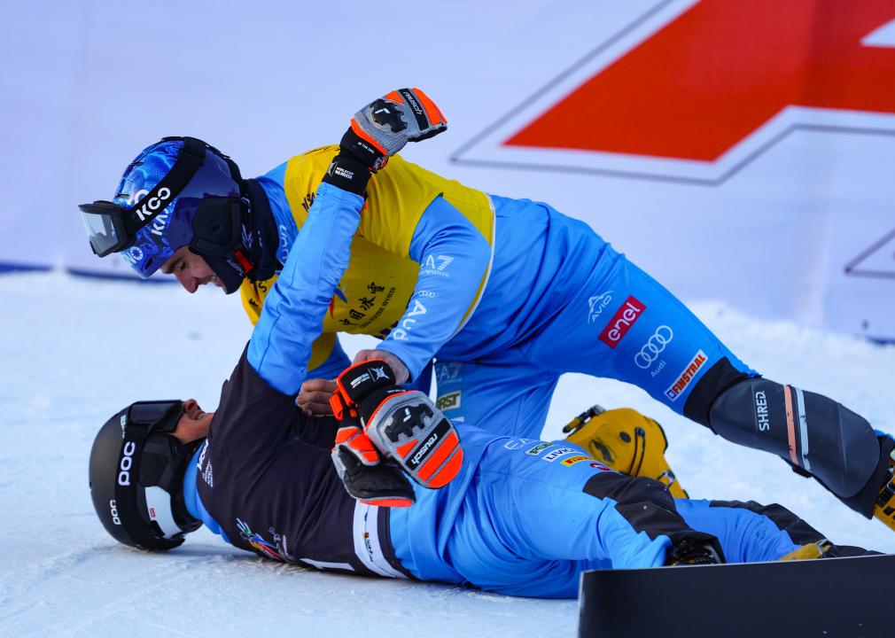 12月7日,男子组冠军意大利选手米尔科·费利切蒂(下)和季军意大利选手毛里齐奥·博尔莫利尼相互祝贺。