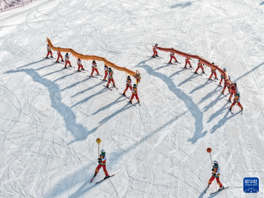 这是12月14日在马鬃山滑雪场拍摄的启动仪式上的表演(无人机照片)。